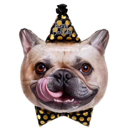 Фольгированный воздушный шар в форме головы бульдога. Рекомендуется надувать гелием — так шар будет держать форму и парить в воздухе. Имеет встроенный клапан, что упрощает надувание.