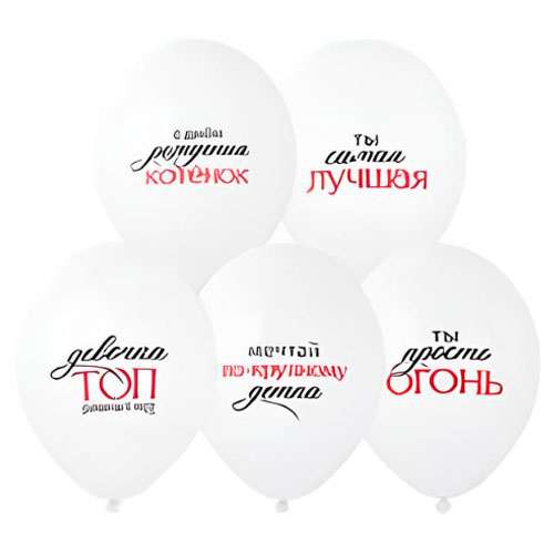 Высококачественный шар из натурального латекса. Белая пастель - матовый оттенок цвета. Шары с двусторонними, двухцветными шелкографическим текстами: Ты самая лучшая, Девочка ТОП равных нет, Ты просто огонь, С Днем рождения котенок, Мечтай по крупному детка. Идеальный ассортимент для розничной продажи воздушных шариков и украшения праздника. Воздушные шары изготавливаются из экологически безопасного 100%-ного натурального латекса. В окружающей среде разлагаются на безопасные компоненты примерно с той-же скоростью, как обычные листья деревьев. После использования лопнуть и утилизировать как бытовой отход.