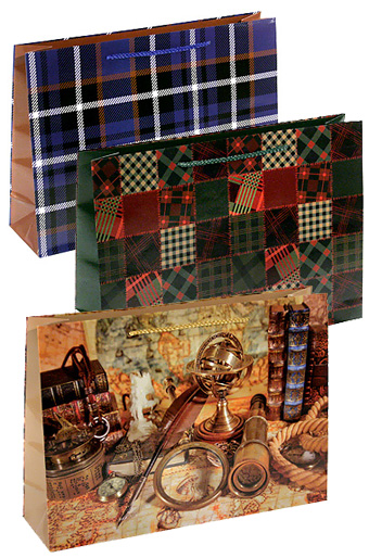В ассортименте. Основной материал: мелованная бумага двустороннего мелования, плотность 150 г/м2. Дополнительная обработка: ламинация матовой или глянцевой полипропиленовой пленкой 12 микрон. Печать: полноцветная офсетная. Ручка: полипропиленовый шнур.
